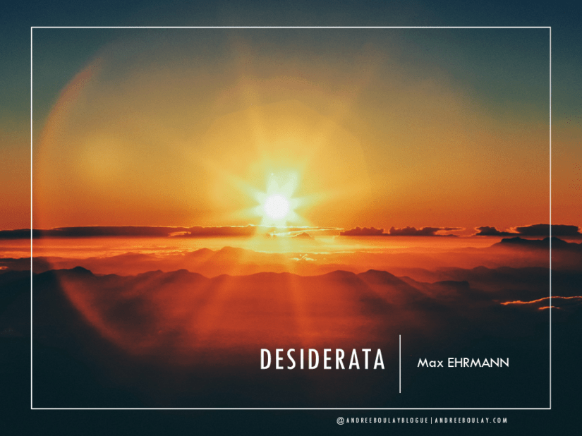 Va, reste calme au milieu du bruit et de l’impatience et souviens-toi de la paix qui découle du silence. Autant que tu le peux, mais sans te renier, sois en bon termes avec tout le monde. Dis ce que tu penses, clairement, simplement; et écoute les autres, même les sots et les ignorants; eux aussi ont quelque chose à dire.